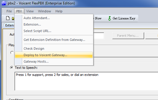 Once you have completed the above along with ensuring the design has been checked and confirmed to have no errors you can deploy the design to the Gateway you are connected to. To do so, go to "PBX" -> "Deploy to Voicent Gateway"
