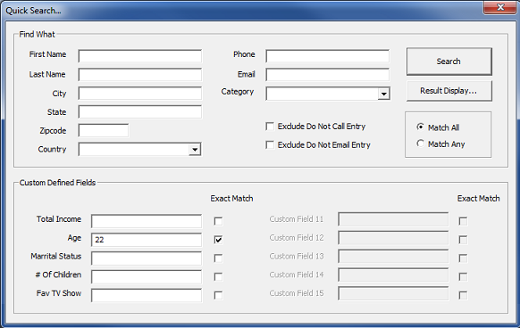 Click the "Result Display" button to set the display options. The CRM customer records have many fields, select the ones you want in the results.