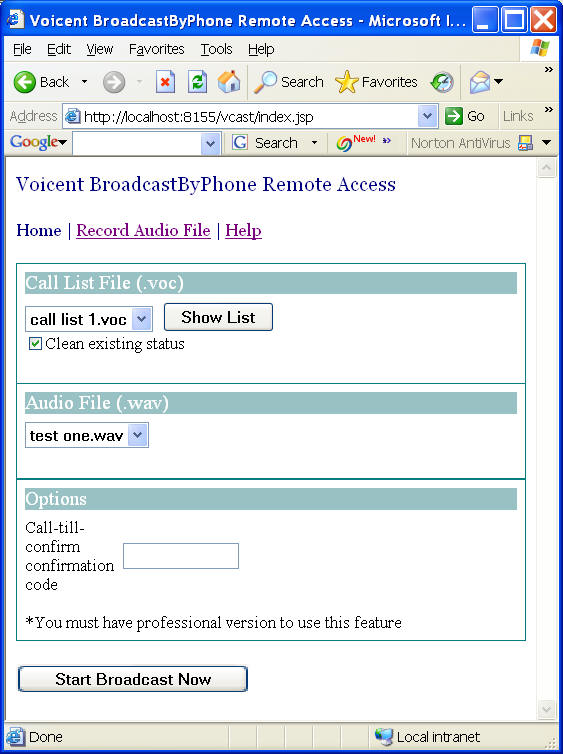 *The call list and wave files should be empty at this point. Please check the next section for setup information. *If you do not see this page, please try the following URL: http://localhost:8156/vcast/index.jsp Try to reboot your machine if it still does not work. Setup Broadcast Files This module only makes available broadcast files under the "webapps" folder for remote access. Create your Broadcast lists (.voc files) using BroadcastByPhone and save them in this folder. If you have audio files you use regularly, save them in this folder also. Once you have your call list saved in the "C:\Program Files\Voicent\BroadcastByPhone\webapps" folder, refresh your browser to see your call list files are listed under the "Call List File" list box. You can also click on the "Show List" button to see the content of the voc file. Remote Broadcast You can access the remote access module by the following URL: http://<my domain name or ip address>:8155/vcast Please replace <my domain name or IP address> with appropriate value. Your computer must be connected to the internet and the port 8155 be accessible from an outside computer. For example, if you have a simple DSL connection, your computer is most likely connected to a DSL modem/firewall/router, you should forward and allow port 8155 from your firewall/router. Setting up your network and configuring for remote access can be complicated. It is beyond the scope of this document. Please note that Voicent does not provide this kind of technical service. Please consult your IT department, technician, or ISP for help. Do the following to start a remote broadcast: