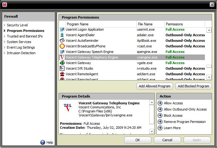 You have to grant full access to Voicent Gateway program in order for SIP to work. For example, if you use McAfee, please open McAfee Security Center, click Configure on the left panel. From the Configure window, choose Internet and Network, click the Advanced… button on the right. You should see the firewall window. Choose Program Permissions on the left panel, you should now see the following window (click the picture to see a larger picture):