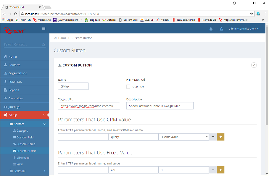 A custom button is a custom defined button in the contact's CRM page. It is used to automatically send the contact's information to other web site or services. In this article, we will define a Gmap button to search Google map using the contact's home address information. By clicking on the Gmap button, the contact's home address information is automatically submitted to Google map's search URL, thus avoiding copy and paste these information manually.